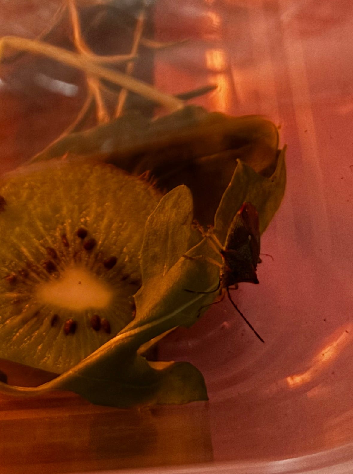 I was at war with myself. I wanted Gregory to have the best life possible, which to me seemed like free reign of the apartment. But I also desperately wanted him to stay safe, and (selfishly) I wanted to stop worrying about him so much. The next time I saw his sassy wobbling walk across the wall, I put him in a terrarium. It wasn’t great. Just a big tupperware with potting soil on its bottom and a saran-wrap lid with air holes poked in. I gave him slices of kiwi that I had bought on a whim but didn’t actually feel like eating. Later I wondered if there was something subconscious that had compelled me to buy shield bug food, several weeks before I even realized I had a ‘pet.’
